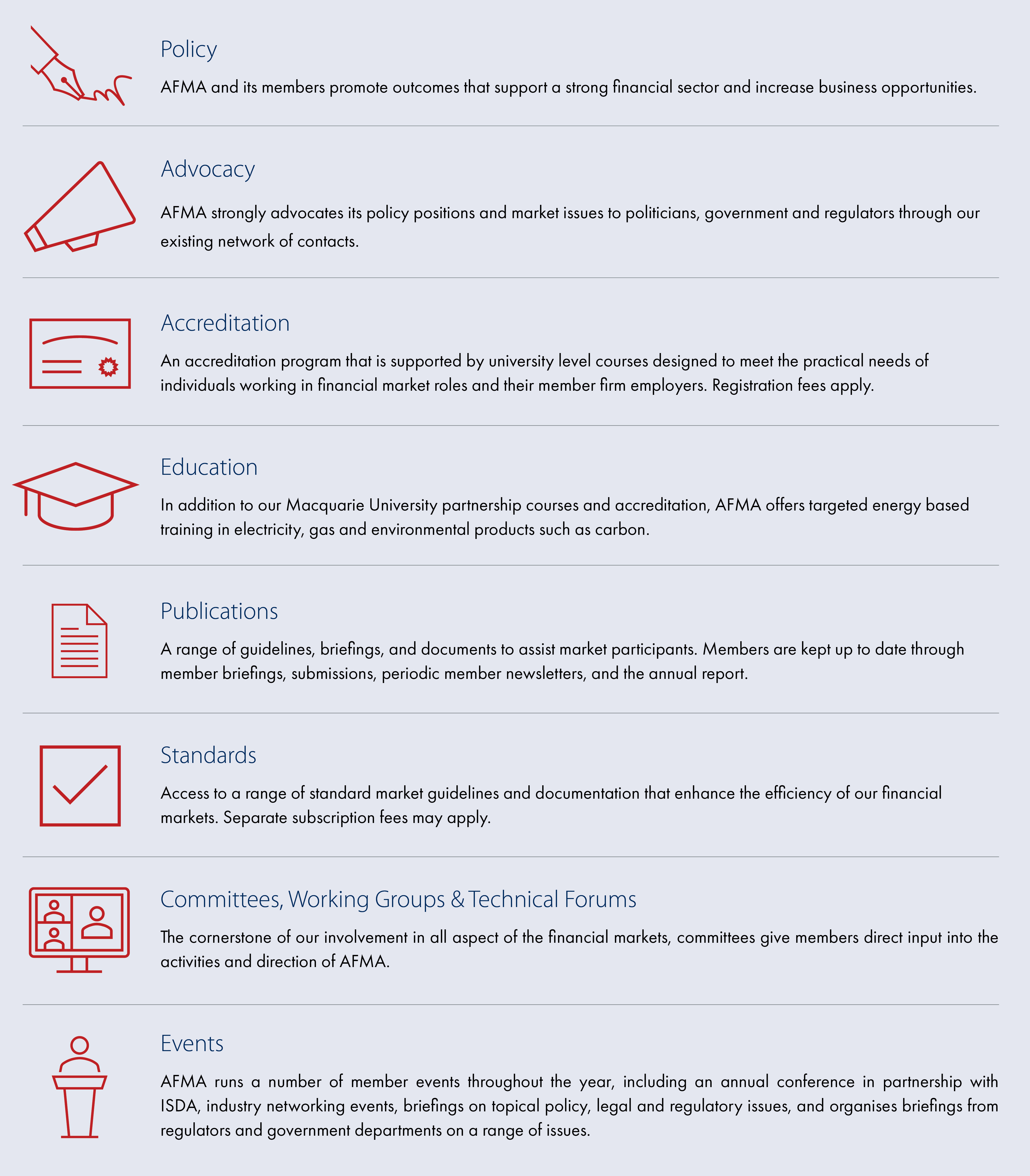 In the interest of members and the broader financial sector AFMA maintains a fundamental role in the efficient operation and ongoing development of domestic financial markets.
